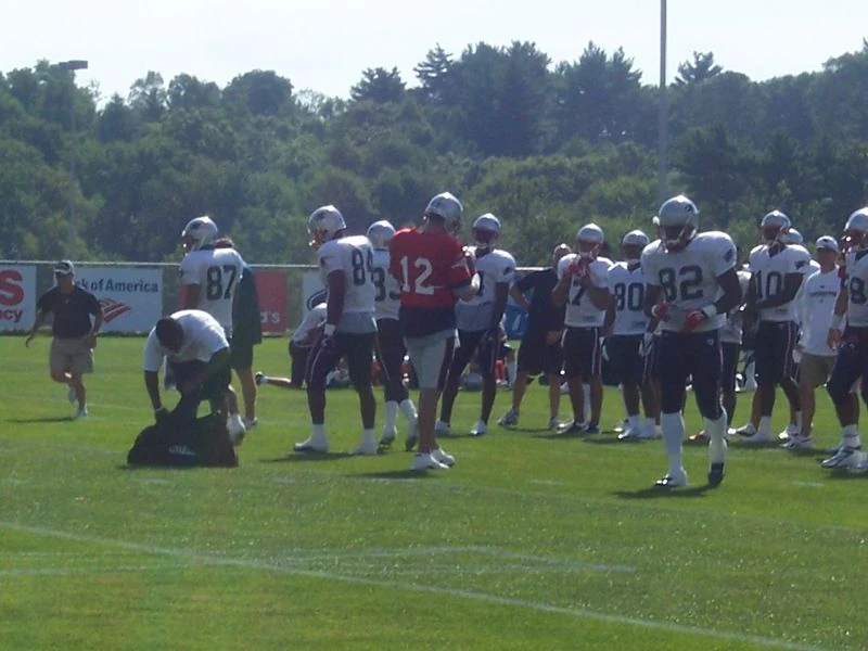 The Patriots' offense practices during the first training camp practice