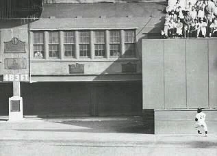 On October 2, 1936, in Game 2 of the 1936 World Series, Yankees centerfielder Joe Dimaggio had made a similar, though far less crucial, catch (his team being ahead 18-4) for the final out of the game.[14][15] The Giants' Hank Leiber had hit a long fly ball to deep center field that DiMaggio caught in the runway, perhaps 430-440 from the plate, and his momentum carried him partway up the clubhouse steps. He then stopped and turned around, as the crowd stood and acknowledged the departure of Franklin D. Roosevelt, who was in attendance that day.[16]