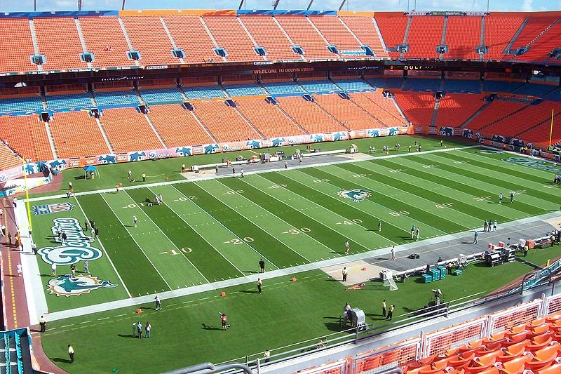 Interior of Sun Life Stadium. When the Marlins played there, the field was juggled among the Miami Dolphins, Miami Hurricanes, and Florida Marlins, making it an extremely used turf.